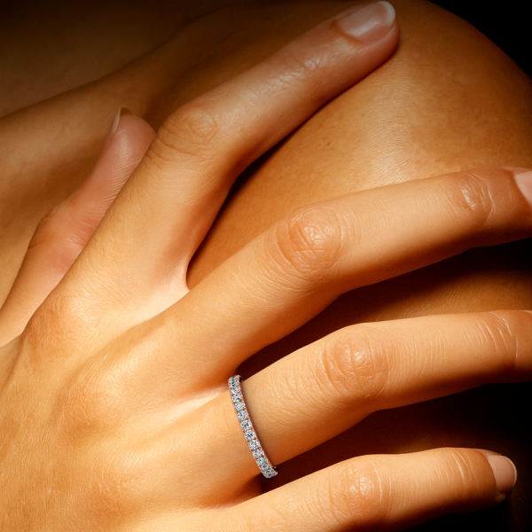Each diamond is precisely secured to maximise sparkle while maintaining a smooth, comfortable finish—perfect for everyday wear or as a sophisticated wedding or stacking band. The slim silhouette makes it an ideal companion to engagement rings, yet stunning enough to be worn on its own.